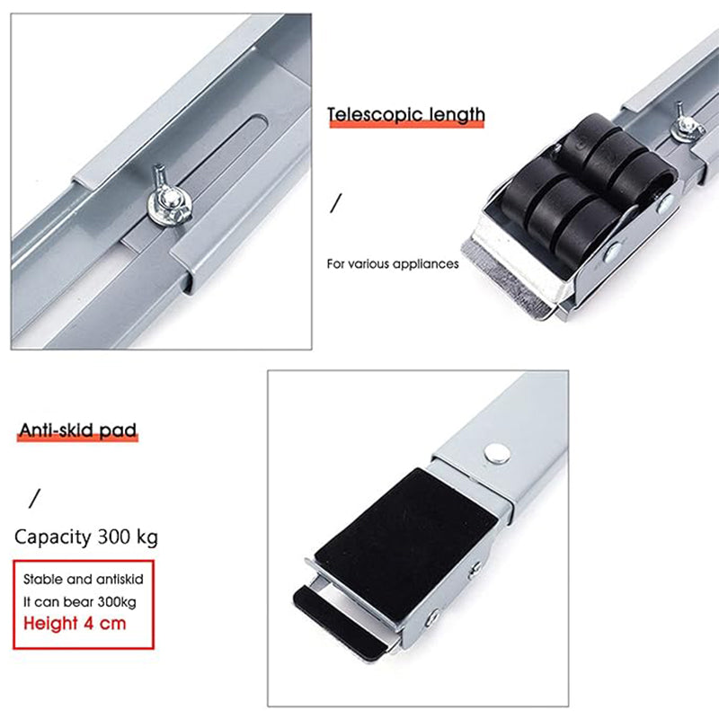 💡 Modo de uso: Ajusta el ancho al tamaño del electrodoméstico, fija los seguros laterales y coloca el objeto sobre la base. Activa el sistema de bloqueo para asegurar estabilidad al limpiar o mover.