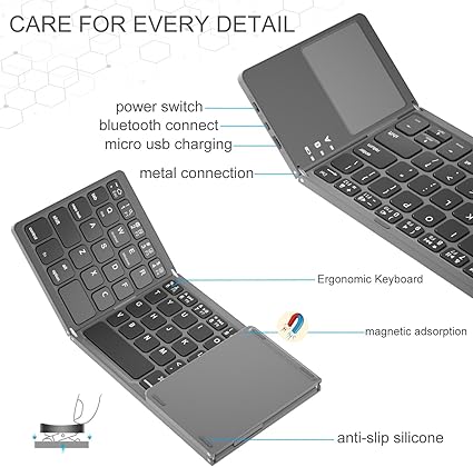 Con 64 teclas de acceso rápido y un diseño plegable en tres partes, este teclado te permite escribir con naturalidad, como si estuvieras frente a una laptop.
